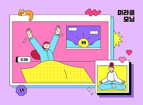 Vector illustration with a woman waking up in the morning to the alarm clock